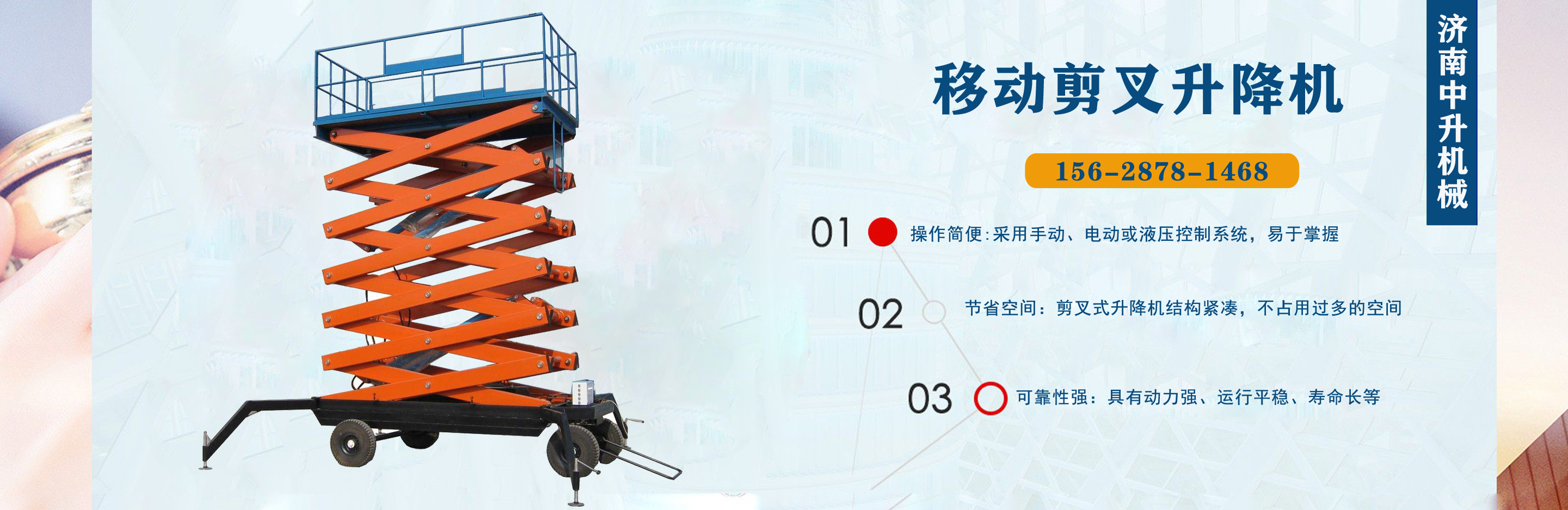 濟南中升機械制造有限公司主營移動升降機,小型移動升降機,移動式升降機,移動剪叉升降機,移動剪叉式升降機等產(chǎn)品,信譽良好,歡迎前來咨詢訂購! 在銷售上,尊重每一個客戶,做到保質(zhì)、保量及時供貨;在售后服務(wù)上,以較短的時間,用較快的速度解決,終身追蹤服務(wù)?! 」臼冀K以“品質(zhì)為本,服務(wù)至上”為公司宗旨。致力于提供高品質(zhì)的產(chǎn)品,完善的服務(wù),快捷的供貨,無論您身處何方,都能感受到我們的優(yōu)良服務(wù)??蛻糁辽希\信為本。 歡迎各界朋友來電,來函垂詢,選購!...